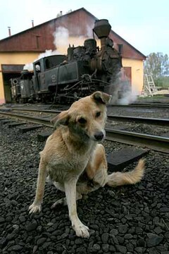 ビスケットを与えると喜んで食べた。犬と蒸機を絡ませて撮るとやたらこの野良犬は身体をかきまくる。