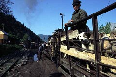 月曜日の山へ向う列車は賑やかである。林業に携わる関係者は金曜日まで降りてこない。この日は運材台車の他三両の客車と家畜車を連結した堂々たる編成だった。無蓋車には家畜用の羊、豚、牛がぎゅうぎゅうに押し込められていた。身動きもできないほどである。