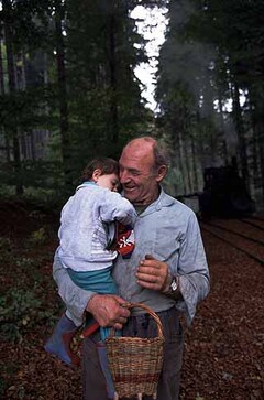 孫を連れてきのこ狩りに来ていた爺さん。まさか蒸機が走るなんて偶然居合わせた子供は驚くばかり。