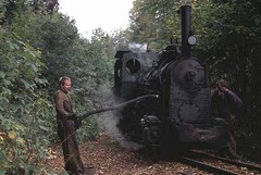 沿線には数カ所湧水を溜めた地下タンクがある。枯葉に隠れているが機関士たちはしっかり覚えているようでホースを取り出しタンクの中に突っ込んだ。吸引して満タンになったらいざ出発。