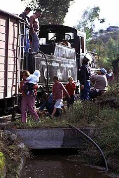 途中の小川で給水タイム。普段から列車本数の少ない路線に蒸機が停車したものだから沿線の住民がびっくり周辺はお祭り騒ぎ。
