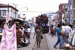 ナランジャトでは町中を堂々、線路が敷かれている。バザールでは商品の片づけにテンヤワンヤ。お尻を振って歩く女性は後方の汽車にも目もくれない。格好の被写体に愛好家らも大喜びだった。