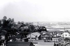 先程まで青いオホーツク海に北風で流氷が戻された。強風で煙が陸側に傾いてしまった。冷たい風が私の頬にオホーツク。ゲッ!