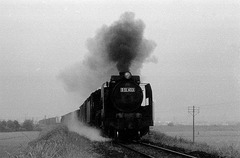 C55、C57と続く早朝のラッシュタイムである。夜露が残る清々しい中、D51の貨物が勢いよく通過。