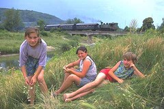 専用線の短い区間だが橋もあり川では近くの子供達が泳ぎに来ていた。花を摘んで家へ戻るとき仕事を終えた従業員列車が通過した。写真を撮ってくれた礼に摘んだ花を私に。
